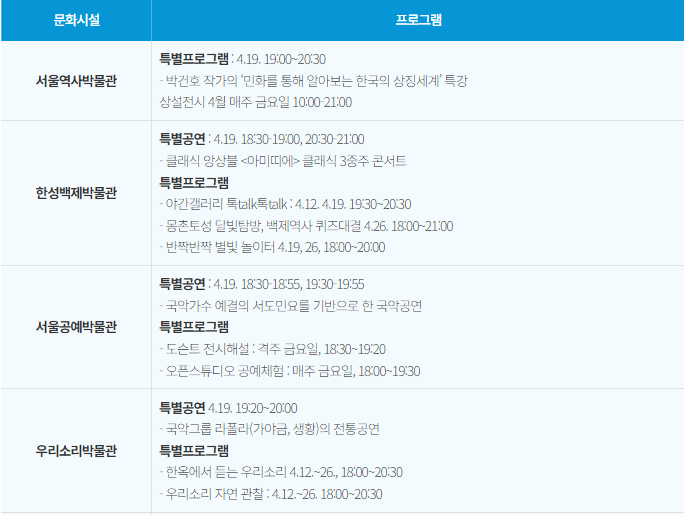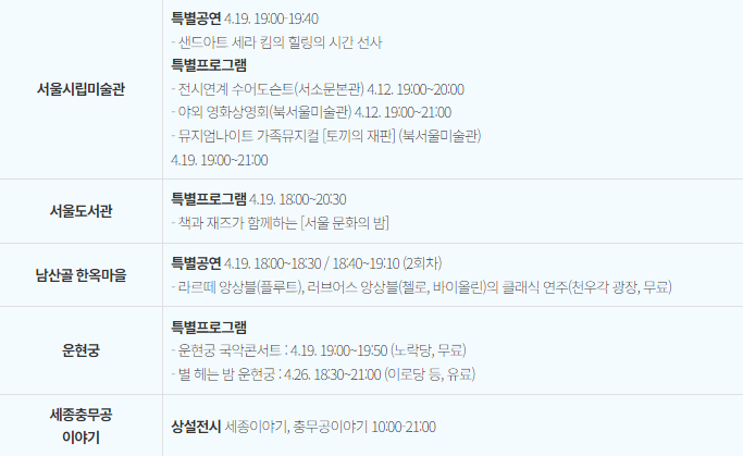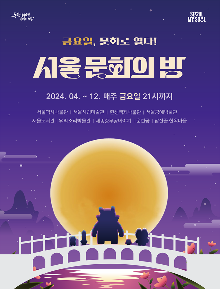 서울 문화의 밤 첫 행사가 4월 19일 열립니다. 서울 문화의 밤은 매주 금요일 밤 9시까지 문화시설 개방, 특별 프로그램을 운영합니다.