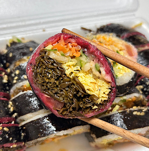 김밥종류가 많지만 그중 눈에 띄는건 생소한 비트톳김밥. 비트로 염색한 보라색밥이 김에 얇게 발려있고, 참기름으로 고소하게 뭉친 톳이 김밥 안에 크게 자리하고 있습니다.