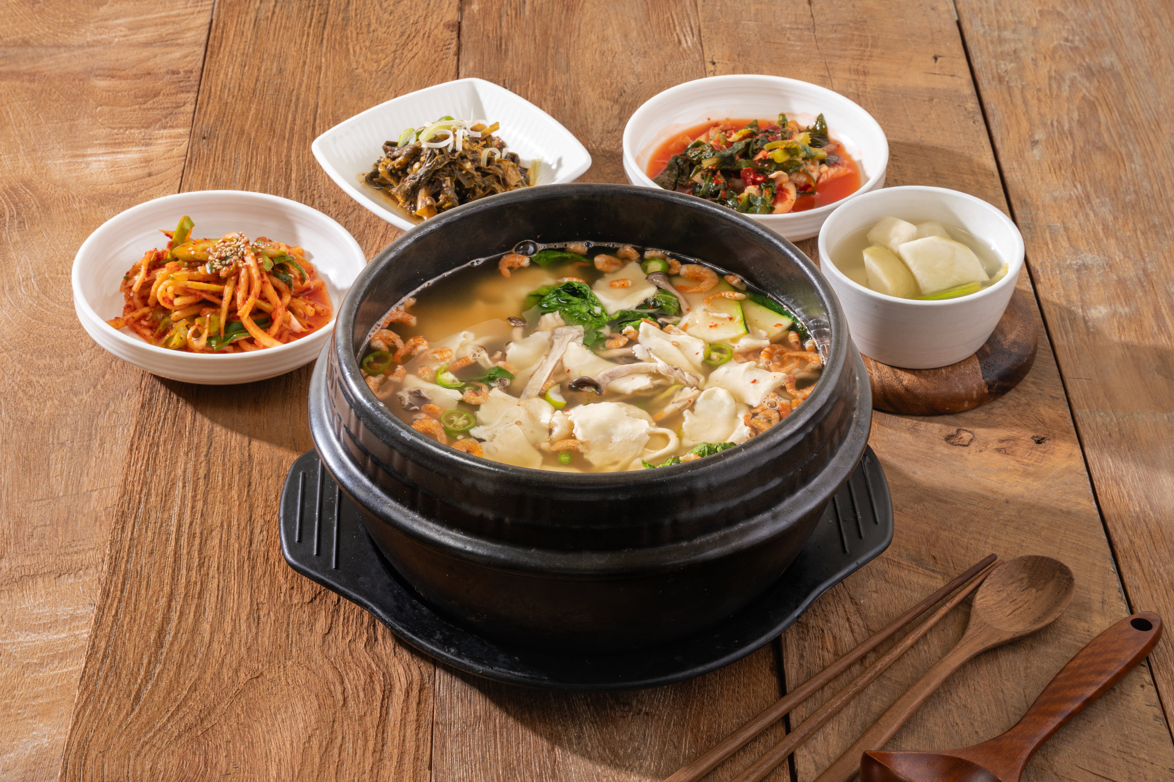 주문 후 빠르게 차려지는 기본 반찬들! 시원한 동치미와 김치, 쌈 채소 (상추, 깻잎), 매콤한 무생채까지, 하나하나 정갈하고 맛있었어요. 특히 무생채는 청국장에 비벼 먹으니 아삭한 식감이 더해져 최고!