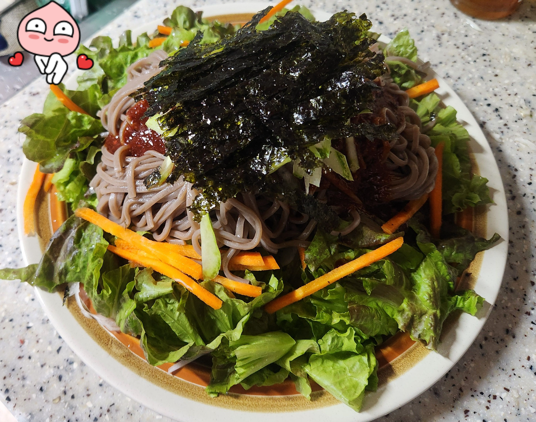 6.그 위에 양념장을 뿌린후 오이채와 조미김을 올려 고명으로 올리시면 끝