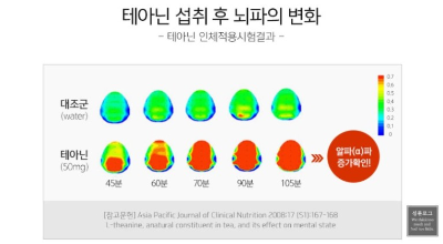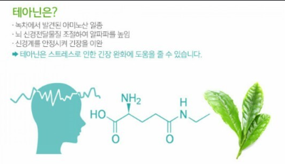 테아닌은 스트레스를 받을 때 만들어지는 호르몬을 조절하는 긴장완화에 도움을 줍니다. 신경이 안정되도록 돕는다고 알려져 있습니다.