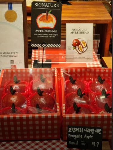 매장에 들어서자마자 눈에 띄는 건 단연 사과빵이었습니다. 마치 진짜 사과처럼 붉은 빛깔을 뽐내는 모습에 감탄이 절로 나왔어요. 겉모습만 흉내 낸 게 아니었습니다.
