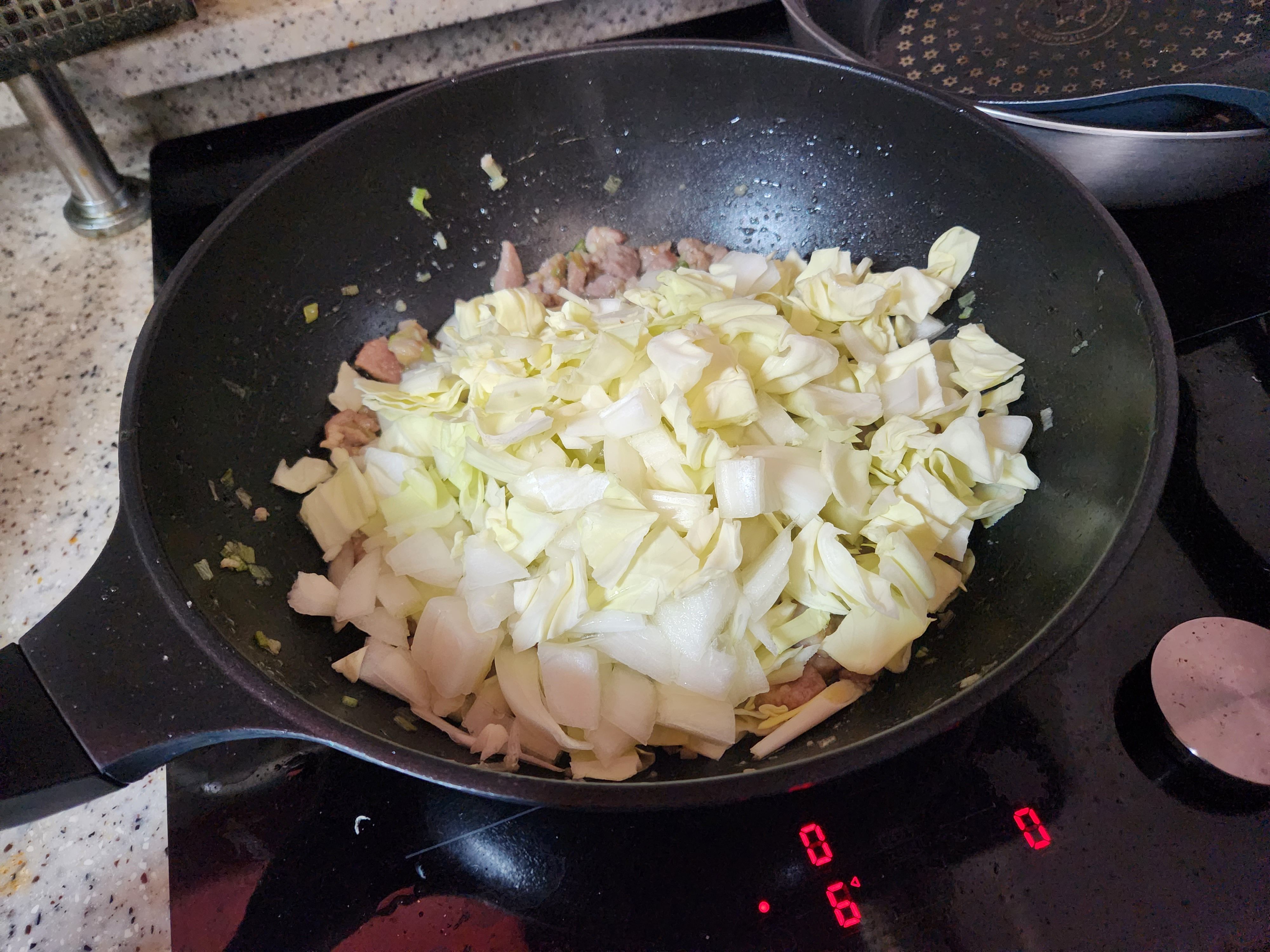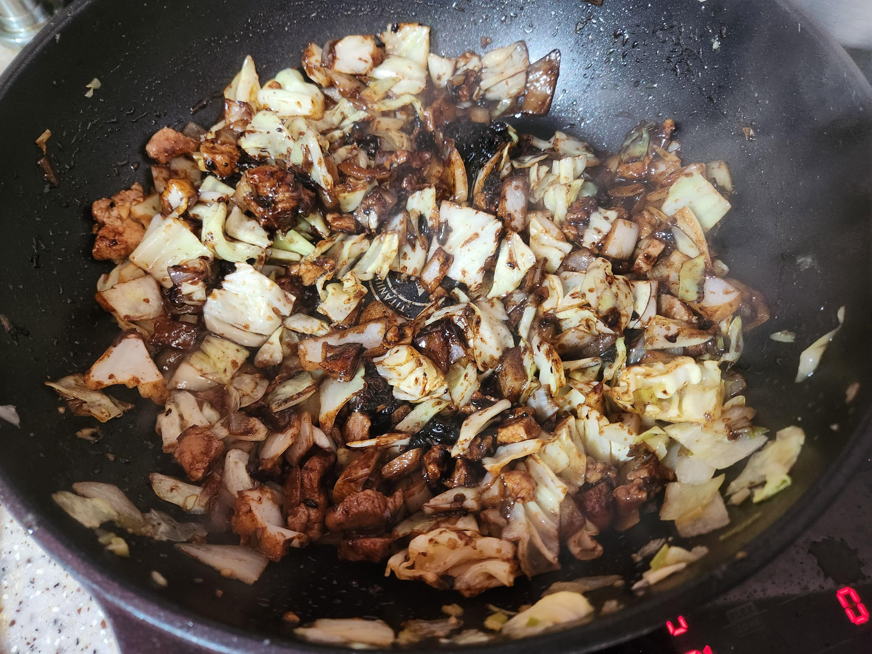 4. 고기가 다 익으면 썰어둔 양파와 양배추를 넣고 볶아줍니다.
