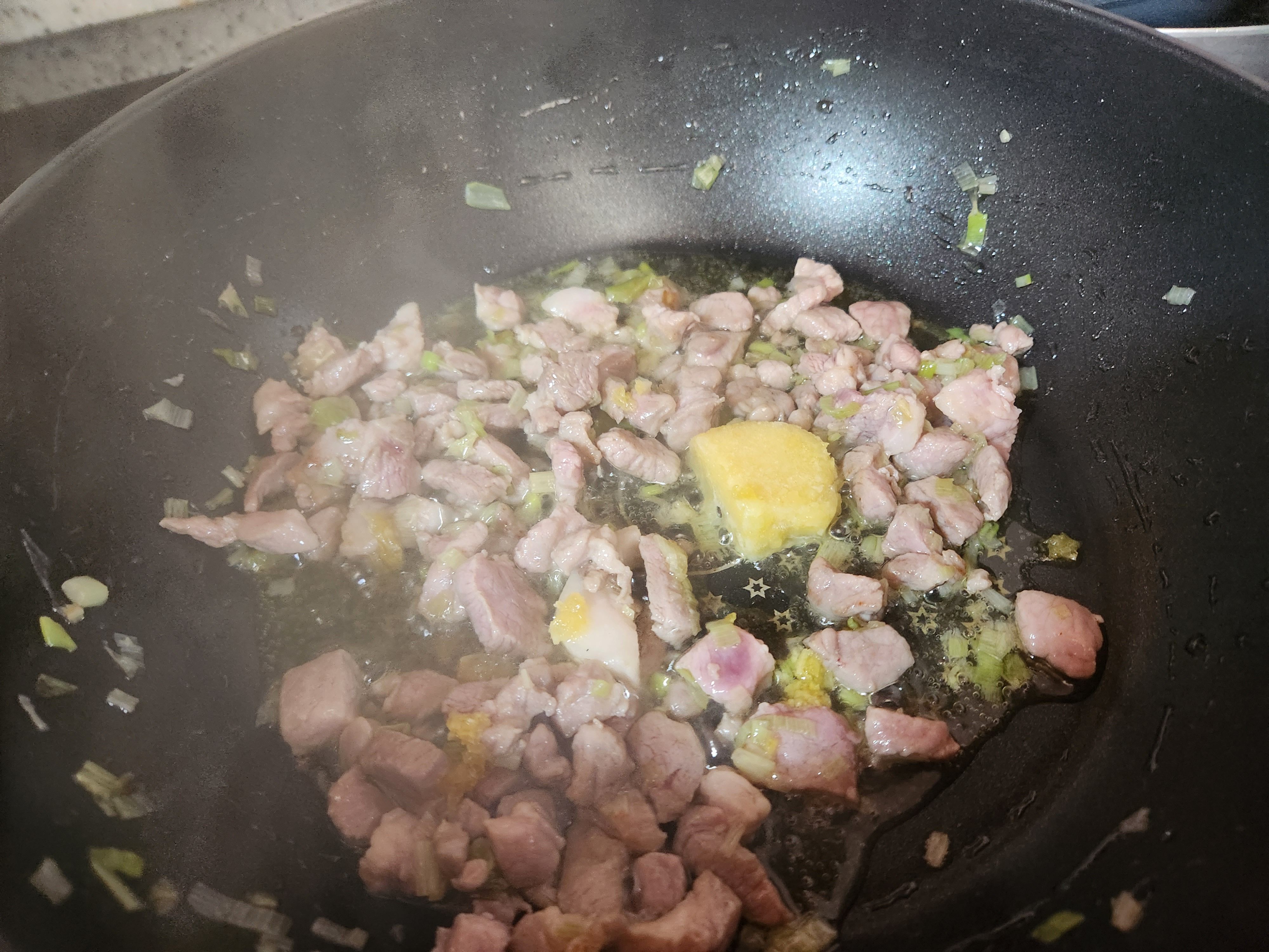 2. 후라이팬에 기름을 넉넉히 두른 후 돼지고기 기름과 다진 대파를 넣고 튀기듯 볶아줍니다