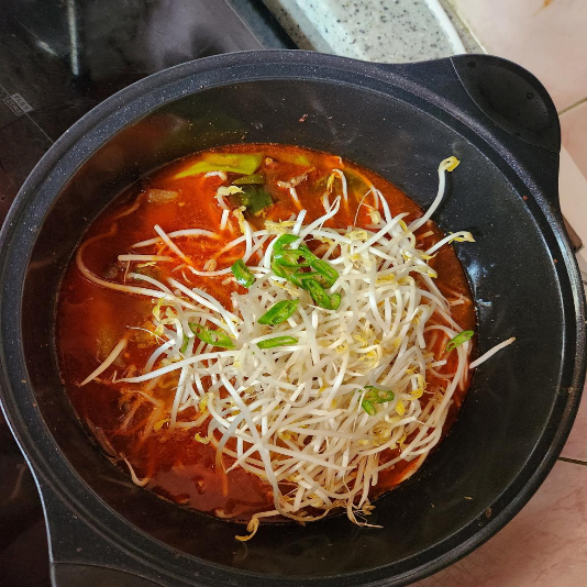 8. 20분 후 숙주 두 줌과 청양고추를 넣어줍니다.