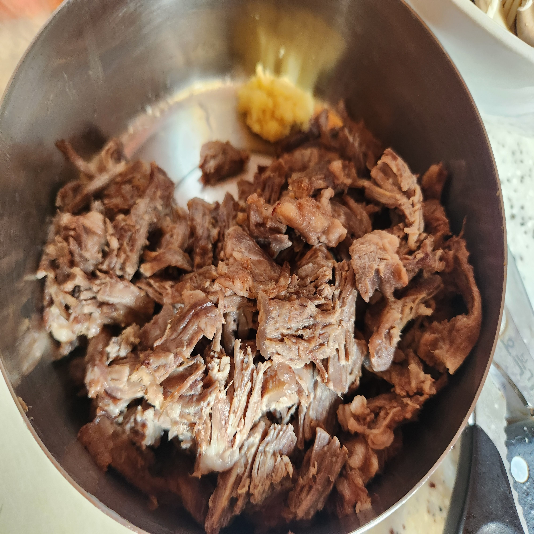 2. 삶아진 고기가 어느 정도 식으면 얇게 찢어줍니다.