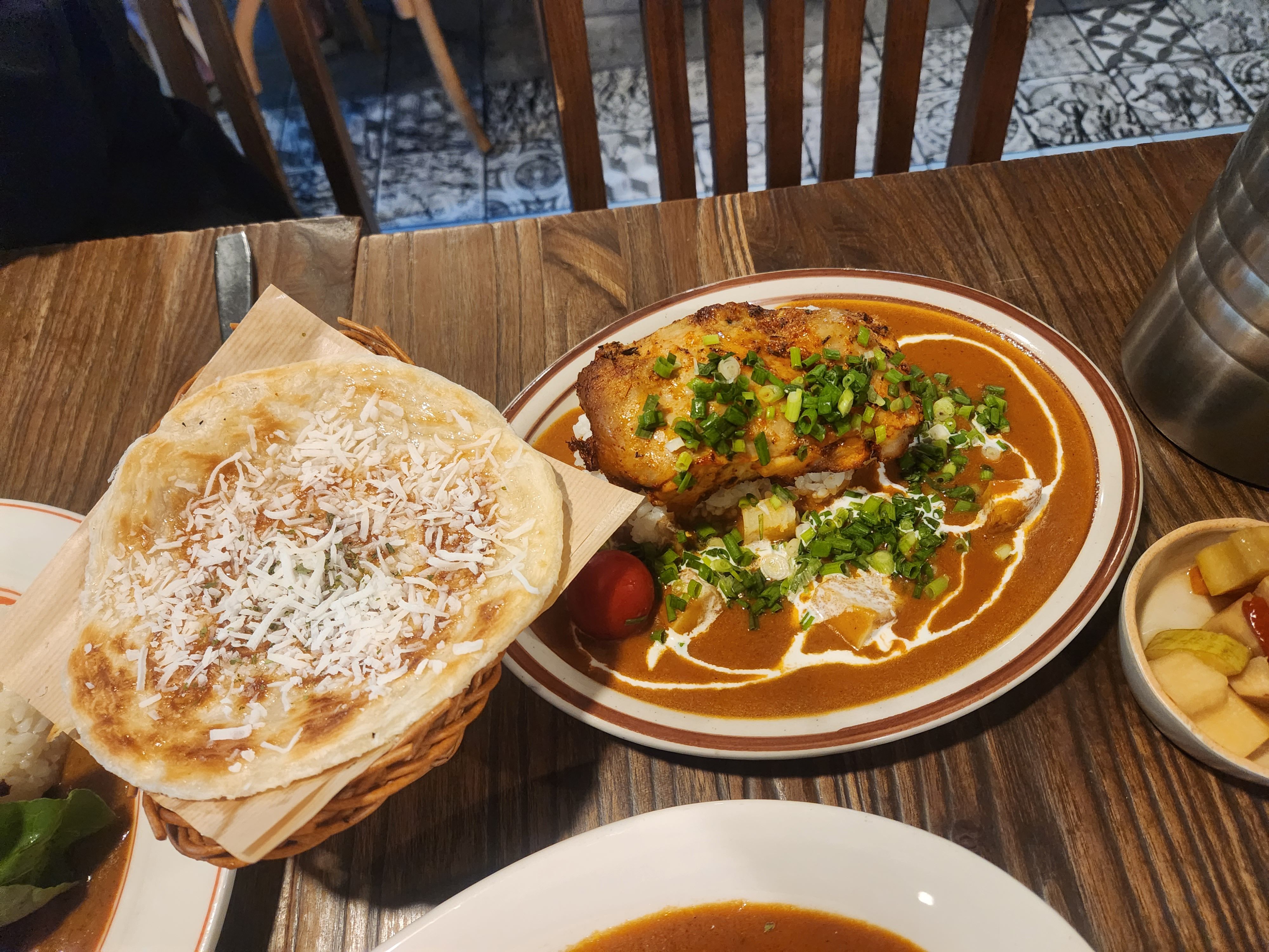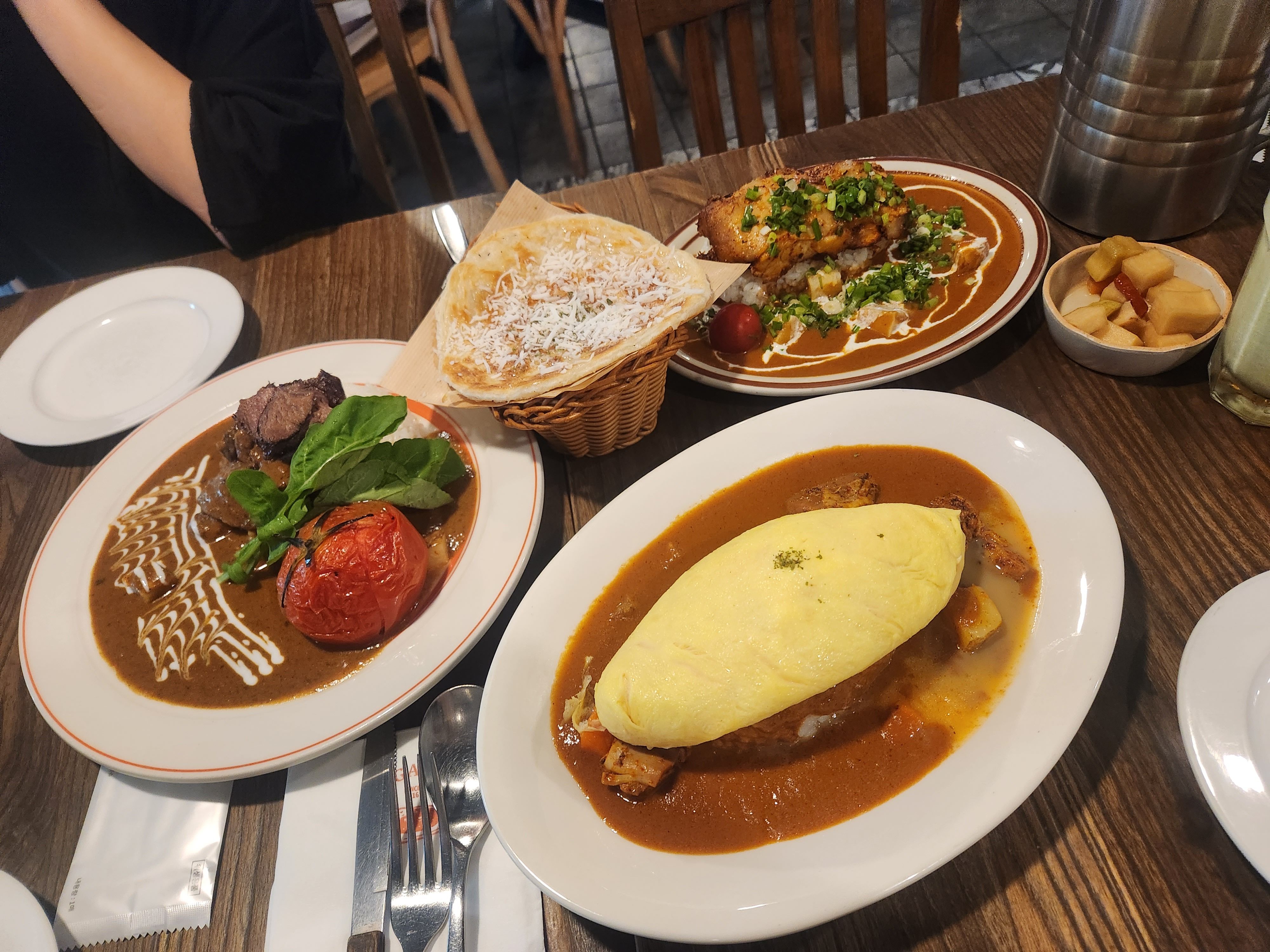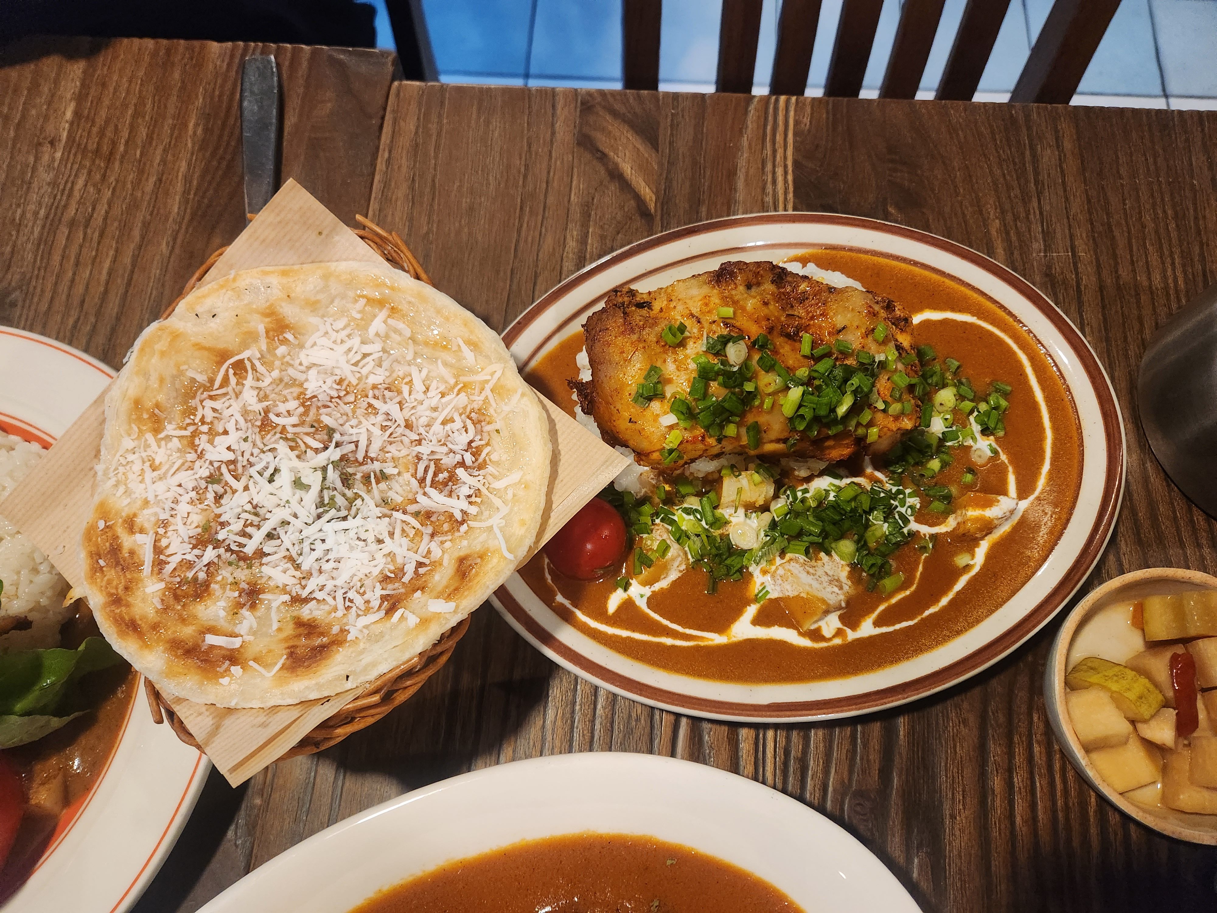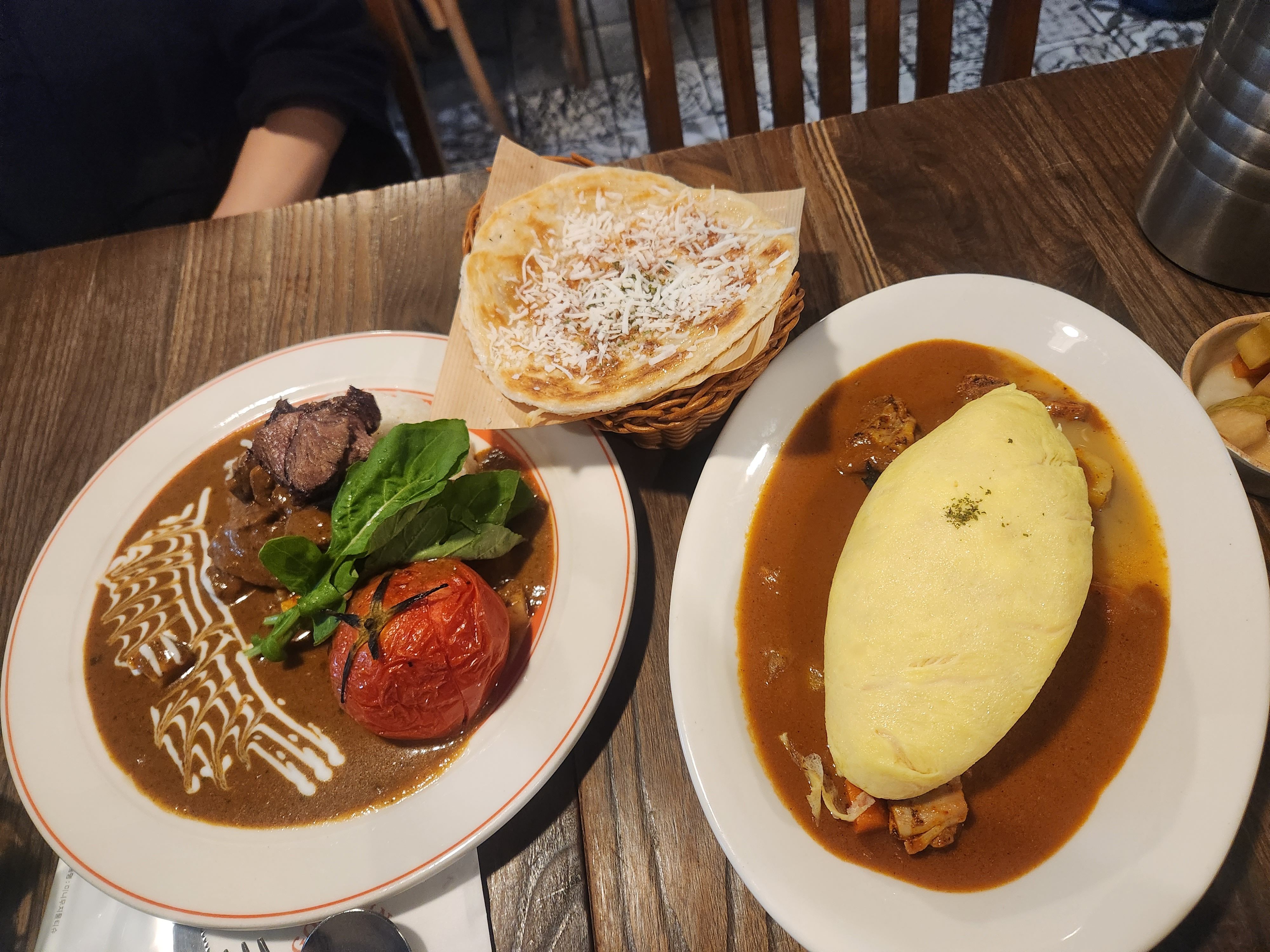 짠~~~ 기다리던 음식이 나왔습니다. 저희는 비프토마토카레, 오므라이스, 버터 치킨 카레, 난입니다. 난은 생각보다 작은 사이즈였어요..