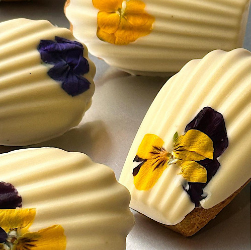 식용 팬지꽃을 화이트 초콜릿가나슈에 얹은 마들렌은