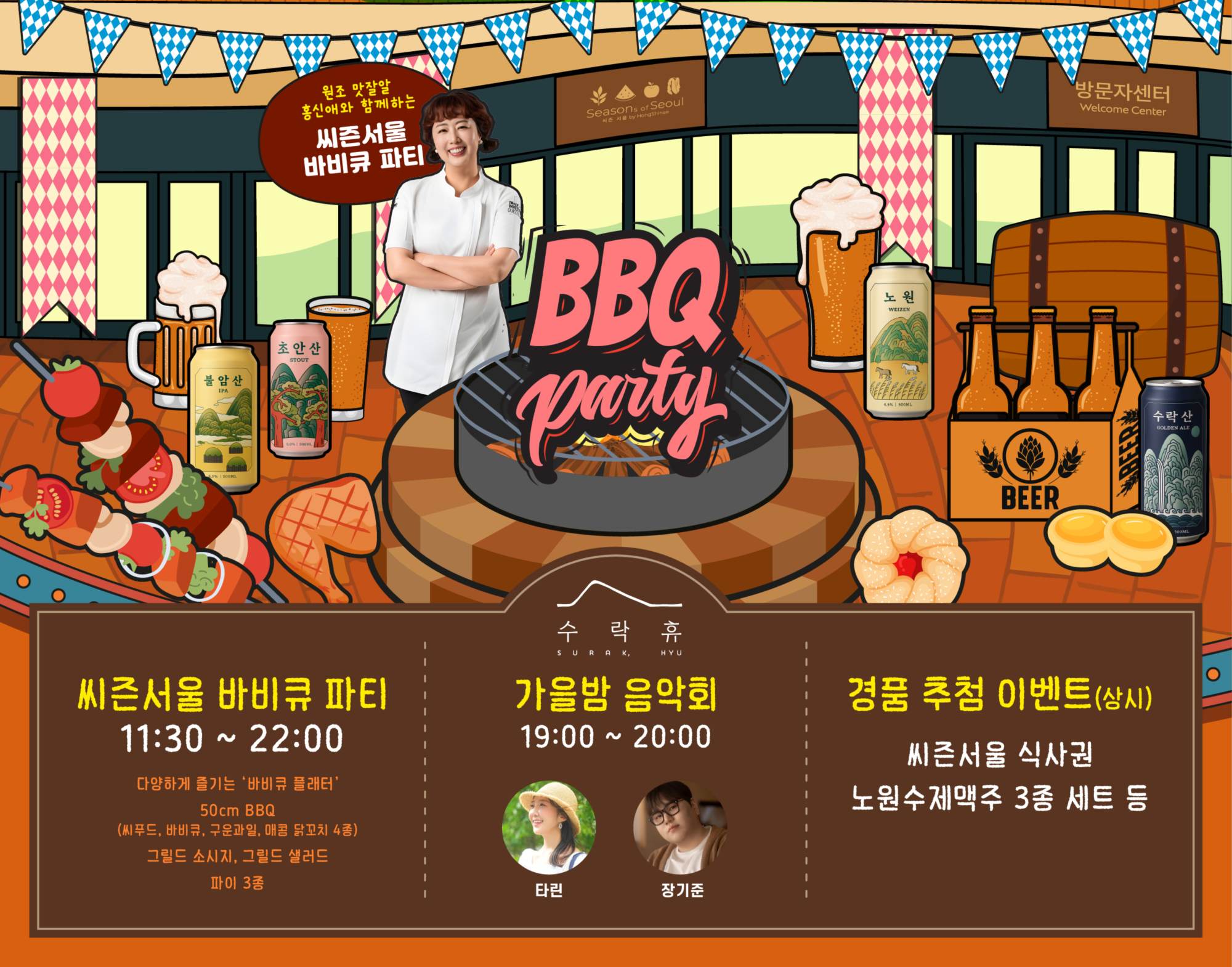 서울 노원구 수락산 자연휴양림 ‘수락 휴’에서 열리는 옥토버 페스트 바비큐&비어 행사! 홍신애 셰프의 바비큐, 노원수제맥주, 라이브 음악까지 즐길 수 있는 도심 속 가을 맥주 축제 정보 총정리.