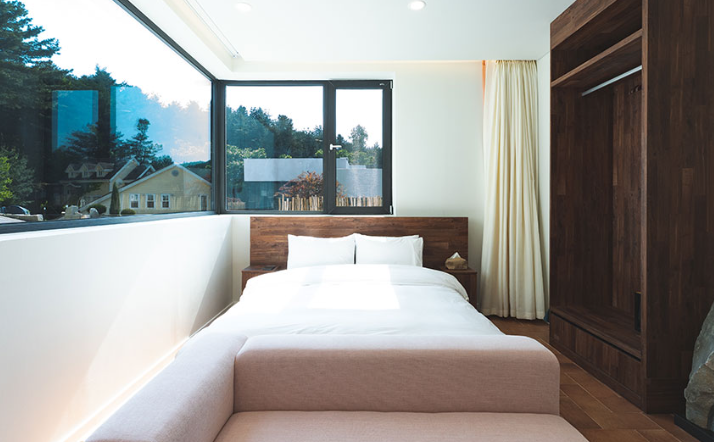 * 특징: 우드톤 인테리어, 프리미엄 침구, 취사 가능