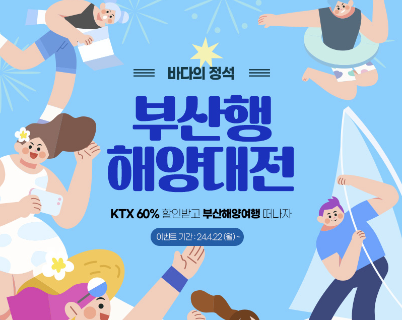 이번 부산행 시리즈는 ‘해양대전-바다의 정석’이라는 주제로 오는 22일부터 철도로 부산을 방문하는 국내외 관광객에게 KTX 요금 60% 할인과 함께 부산의 해양 관광 상품을 결합해 판매할 예정이라고 해요.