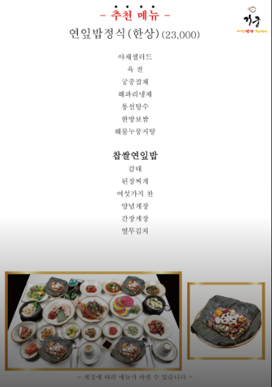 쌀밥이 맛있기로 소문난 이천에는 연잎밥으로 유명한 한식당이 있습니다. 이곳은 앞서 소개한 연잎밥 공장을 운영하는 곳으로, 퀄리티 높은 연잎밥을 맛볼 수 있다는 장점이 있습니다. 푸짐한 한정식 상차림에 향긋한 찹쌀 연잎밥을 곁들이면 건강하고 든든한 한 끼 식사가 완성됩니다. 특히 여름철 많은 사람들이 찾아와 연잎밥 정식을 즐긴다고 하네요.